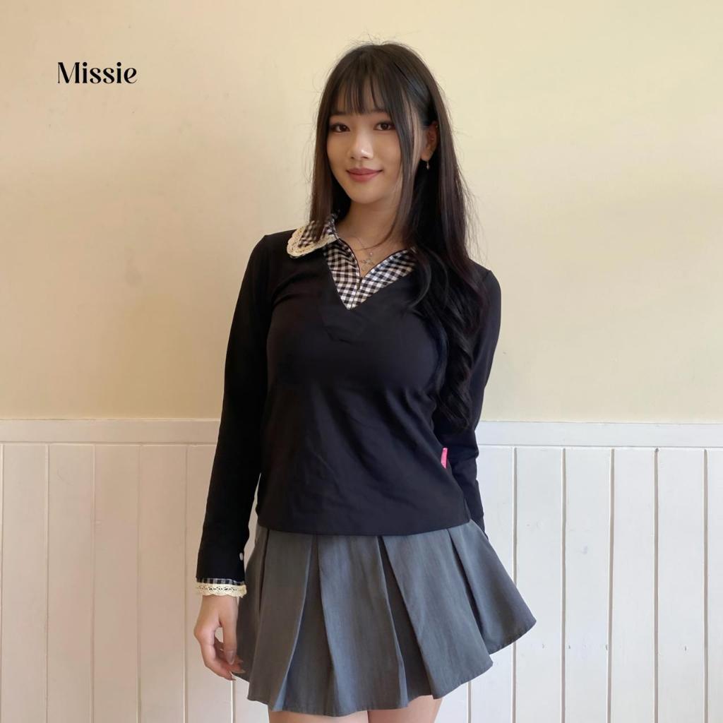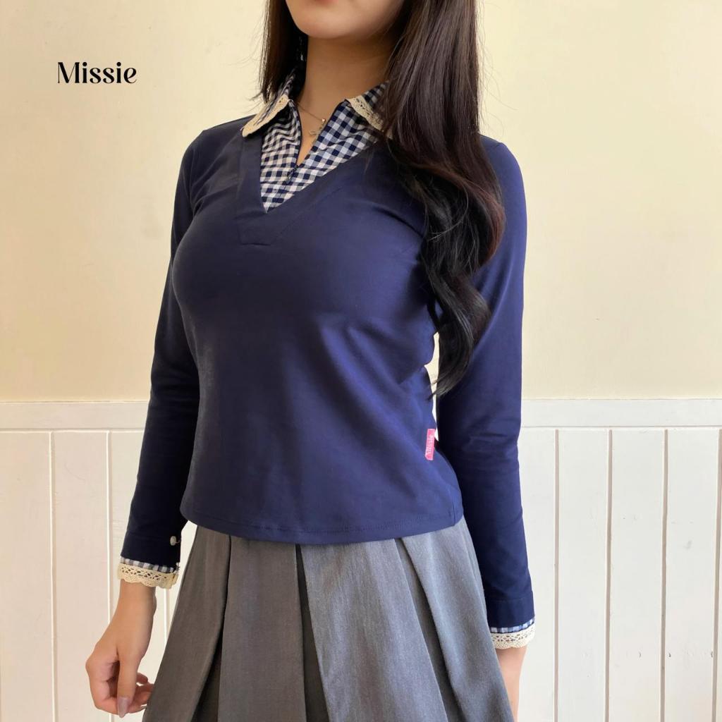 Missie – Alexa Kaos Layer Kemeja Kotak V Neck Preppy Look Lengan Panjang Wanita