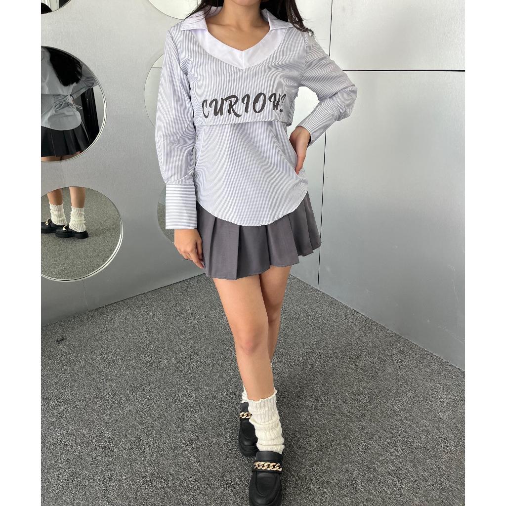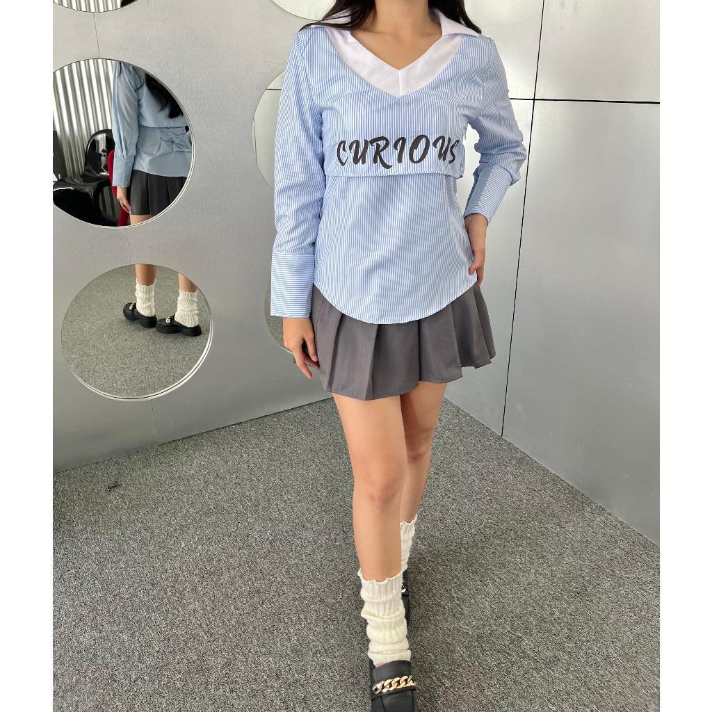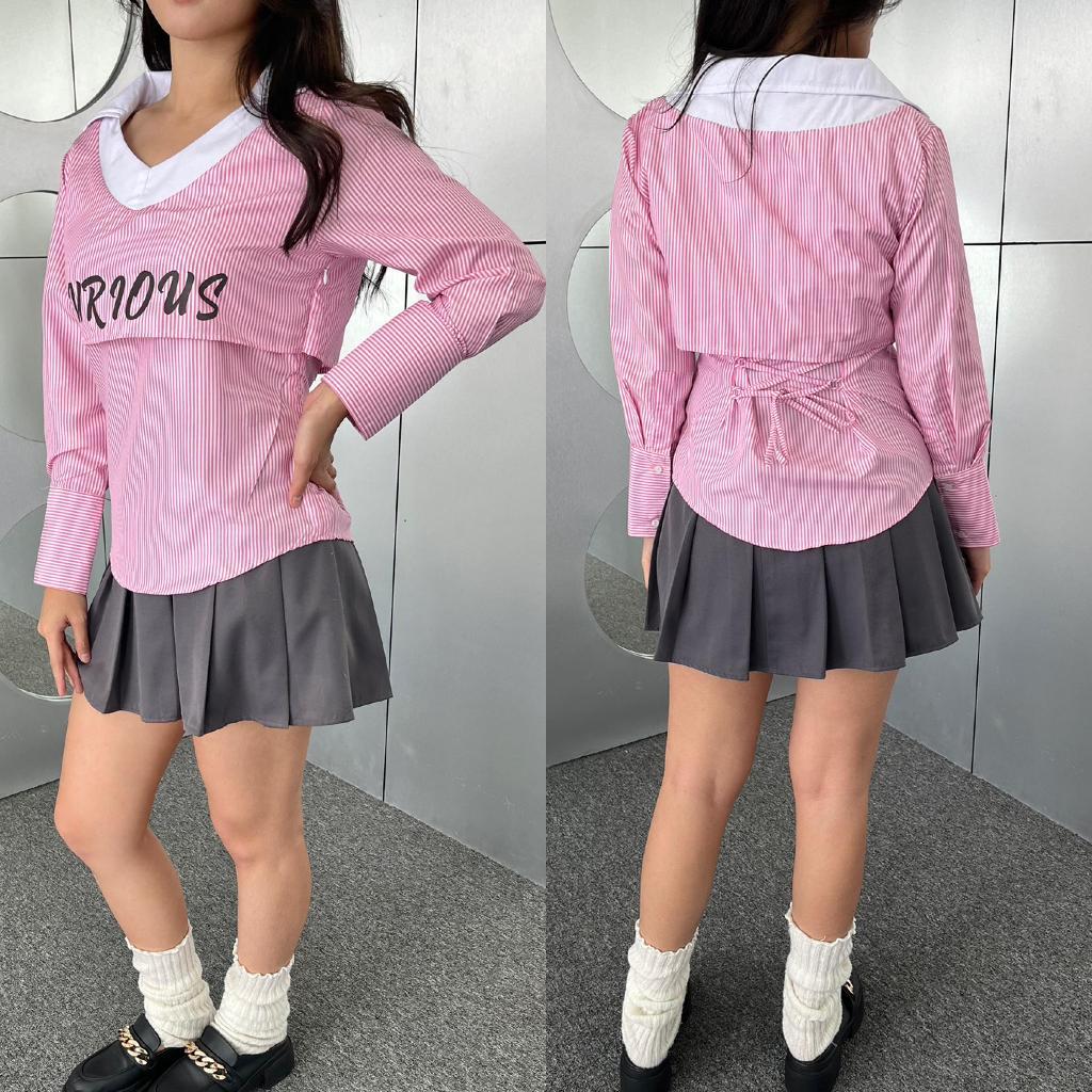 Missie - Alexa Kaos Layer Kemeja Kotak V Neck Preppy Look Lengan Panjang Wanita