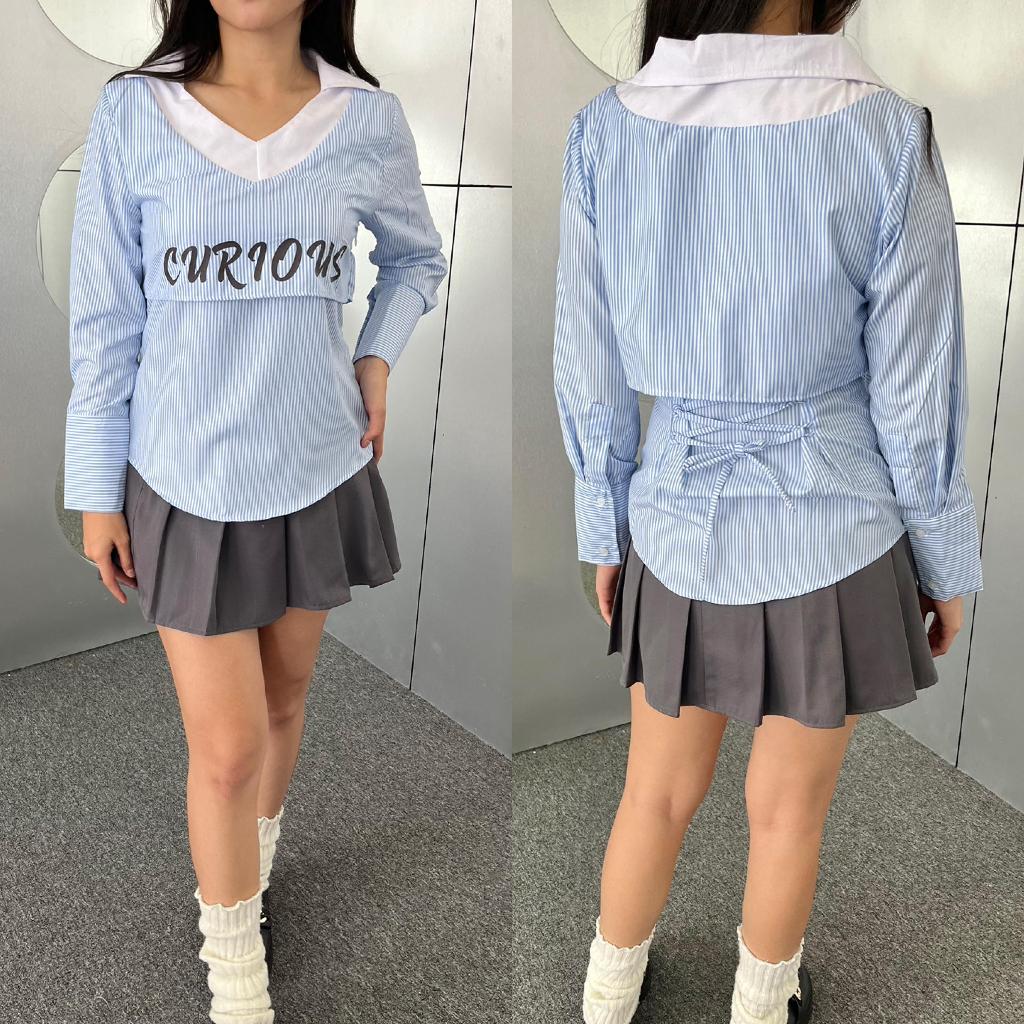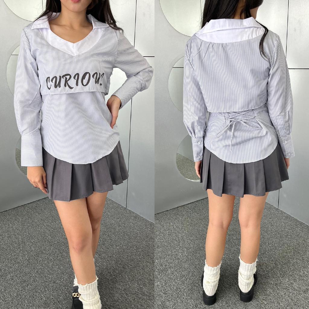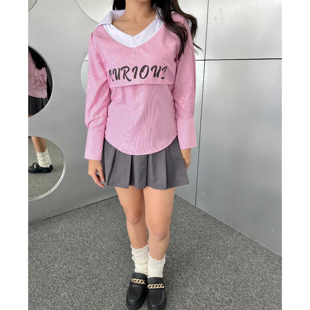 Missie - Alexa Kaos Layer Kemeja Kotak V Neck Preppy Look Lengan Panjang Wanita